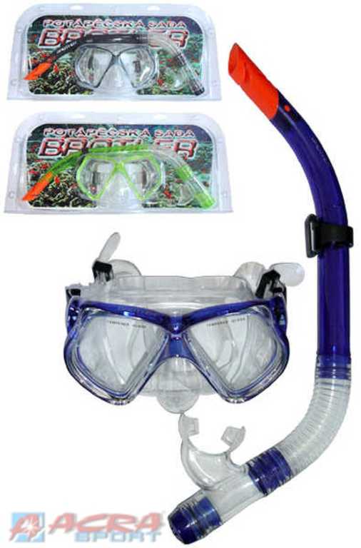 Potápěčská sada – brýle s tvrzeným sklem, šnorchl s krytkou a výfukem.Speciální přilnavý materiál brýlí zaručuje velmi dobrou těsnost brýlí. Krytka na šnorchlu zabraňuje vdechnutí vody při plavbě na hladině. Dodáváme v barvách – kouřová, žlutá a modrá.