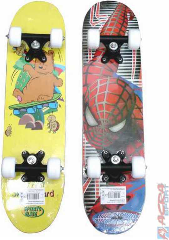 Skateboard dětský – dřevěná deska. Lehký skateboard, určený pro menší děti. Limitní hmotnost je cca 30 kg vzhledem k plastovému podvozku. Rozměr desky je 58 x 16 cm. K dispozici typ medvídek, nebo spiderman, viz foto.