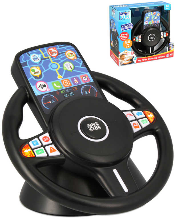 Elektronický volant, který má spoustu funkcí: brzda, plyn, dotyková obrazovka, navigace, rádio (50 hudebních melodií), klakson, blinkry. Hračka je vhodná pro děti od 18 měsíců. Vyžaduje 2× AAA baterie, které jsou