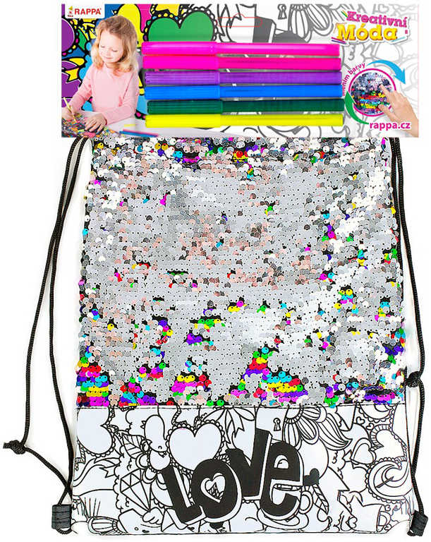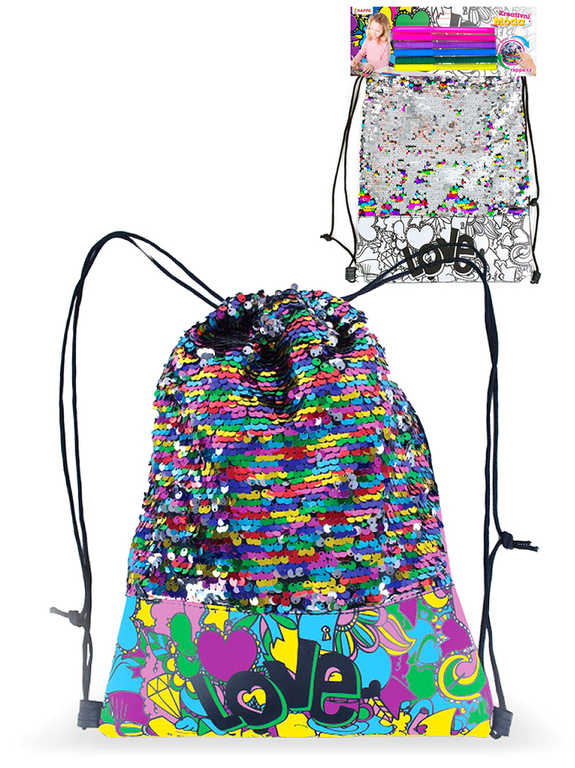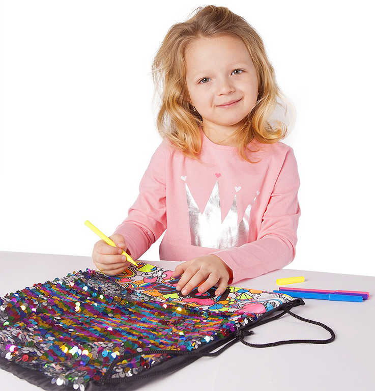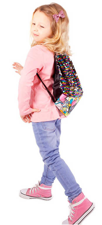 Tento senzační pytel/vak je parádním doplňkem pro holčičky, které chtějí být opravdu COOL! Uzavření probíhá stažením provázků, vak lze nosit přes rameno nebo připevnit k aktovce. Pytel ve velikosti 29 x 30 cm je zdoben barevnými flitry, které můžeš měnit jednoduchým pohybem ruky. Spodní díl je dekorován částí určenou k vymalování. Součástí je 5 barevných fixů, kterými můžeš podle své fantazie pytel/vak domalovat. Fixy jsou omyvatelné. Vytvářej styl a ukaž svým kamarádkám, co v tobě je!