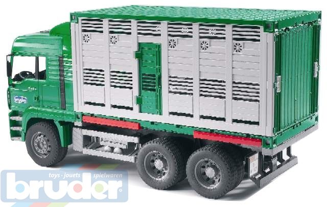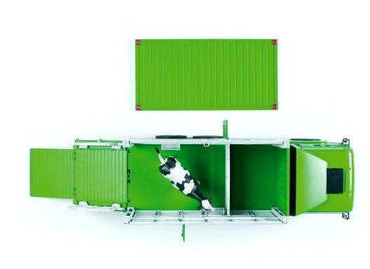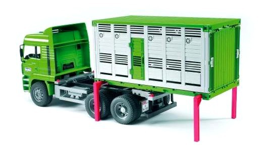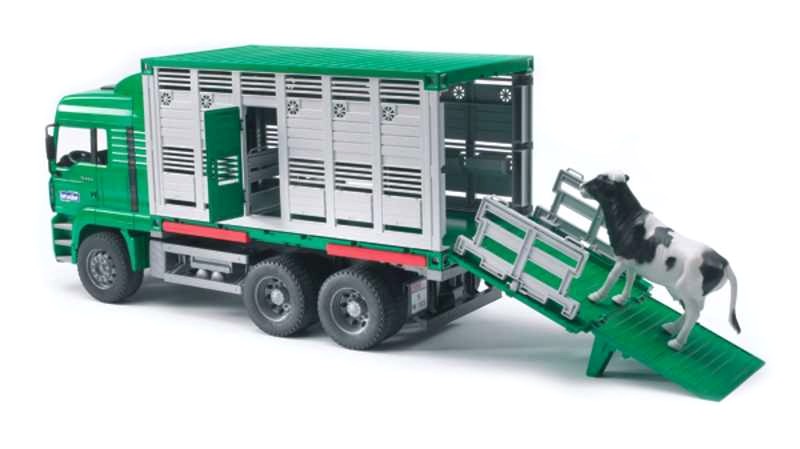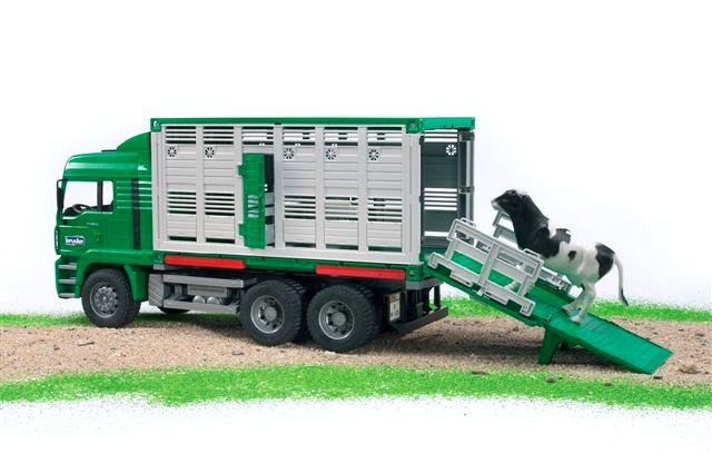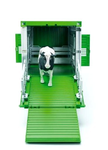 Přepravník skotu MAN + 1 kráva, odklápěcí kabina s pohledem na motor a pohyblivými zrcátky. Kontejner lze rozložit na jednotlivé části a opětovně poskládat v různých variantách. Zadní vrata fungují zároveň jako nakládací rampa na obě strany, rampy je možné připojit. Zábradlí lze otevřít a dvoje boční dveře na stěny se dají zavěsit jako dva žlaby. Balení obsahuje jednu krávu (další se dají dokoupit – B02307). Zhotoveno z velmi kvalitního plastu.