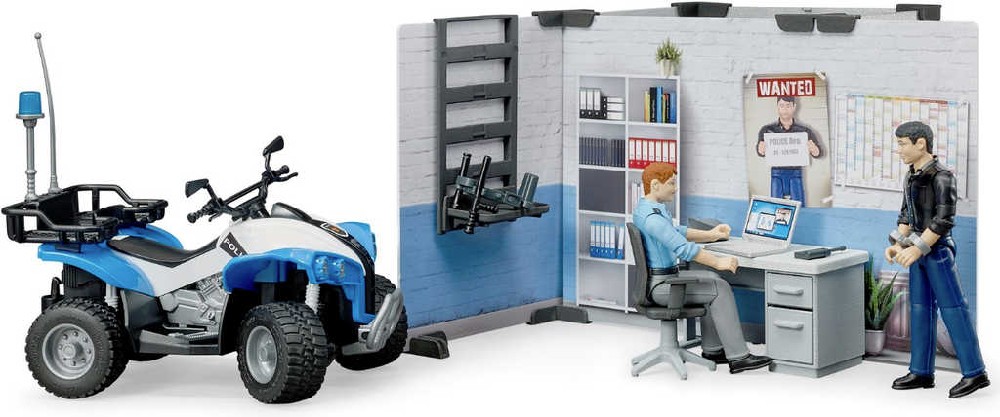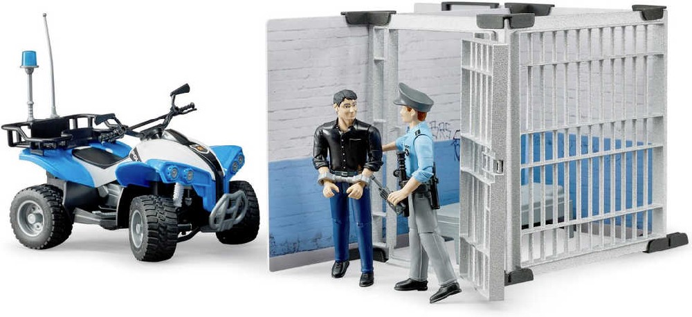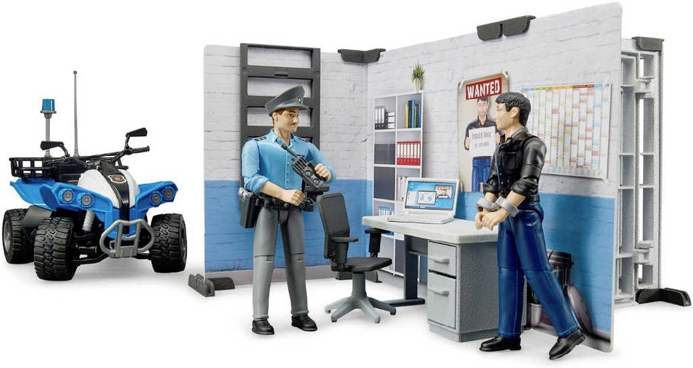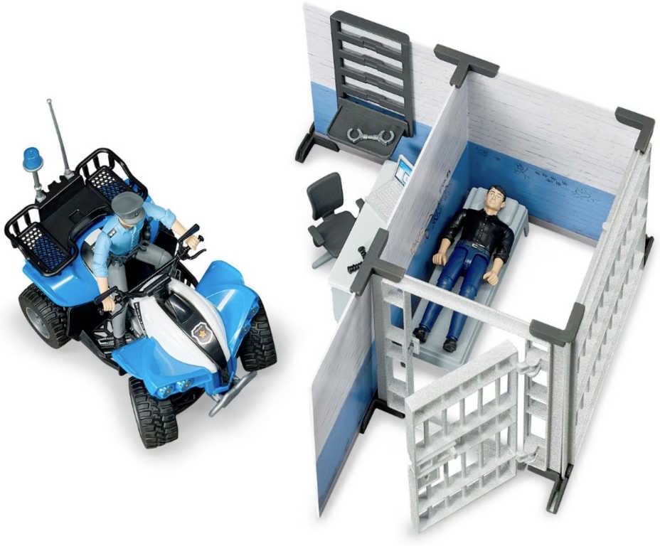 Strážník zabezpečující policejní služebnu s celou dočasného zadržení, je jednou z figurek Bworld. Stejně tak i muž, kterého právě zatýká. Policista má k dispozici vybavení pro zápis protokolu a také zaparkovanou čtyřkolku pro další služební výjezd.
