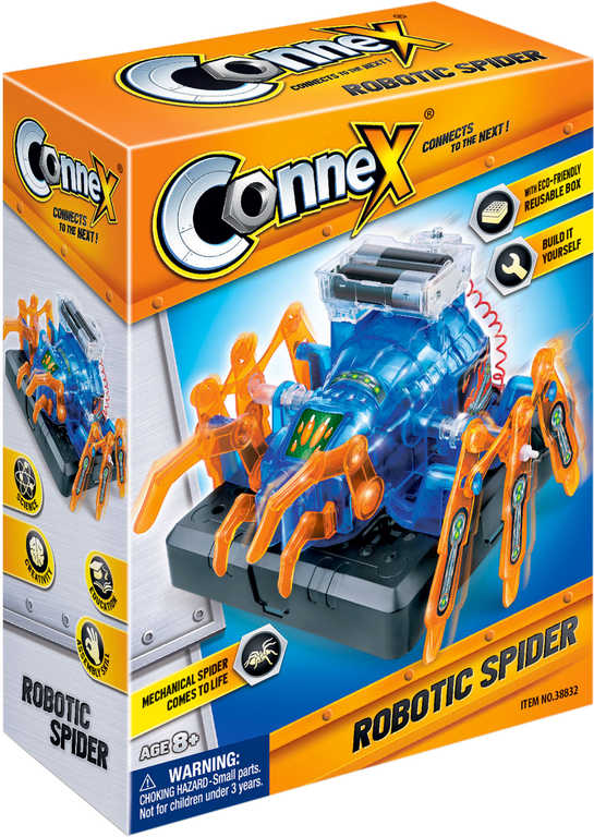 Stavebnice Connex – Robotický pavouk. Stavebnice, s jejímiž dílky si děti mohou sestavit pohyblivého pavouka. Hračka na baterie.