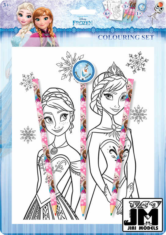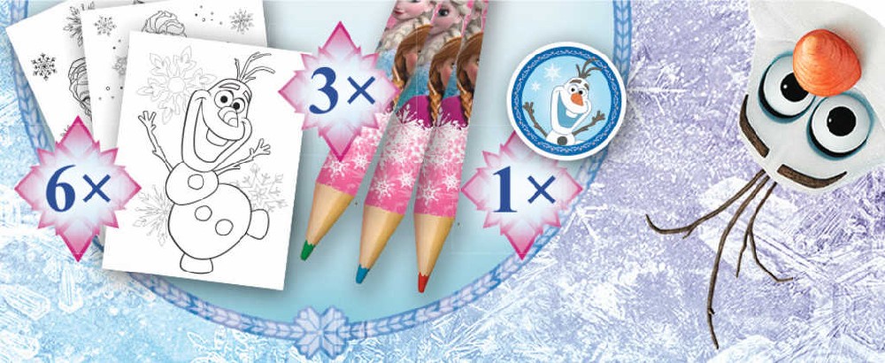Kreativní set pro všechny výtvarně nadané holčičky, obsahující omalovánky s motivy Ledového Království, barevné pastelky a gumu.