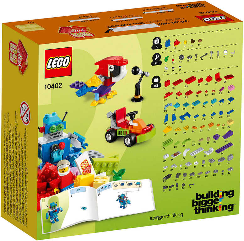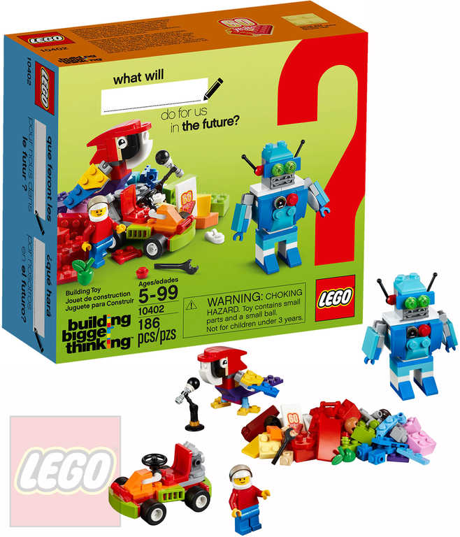 Podpořte své dítě k tomu, aby si kladlo vyšší cíle, stavělo náročnější konstrukce a zapojovalo svou představivost, díky této sadě LEGO ve speciální edici inspirované budoucností. Najdete v ní celou řadu barevných kostek a dalších součástek, včetně jedinečné ploché destičky k 60. narozeninám značky LEGO. Kostky LEGO rozvíjejí dětskou fantazii a vůbec nezáleží na tom, jak velká už je. Tato stavebnice nabízí různé úrovně stavitelské obtížnosti a představuje ideální volbu pro začínající LEGO stavitele. Sada obsahuje minifigurku. Co si váš malý myslitel postaví? Jak nám budou v budoucnosti pomáhat roboti? Zjisti, jakou radost ti může přinést tvoření z kostek LEGO, a vyrob si robota, který ti pomůže s domácími pracemi, nebo si postav tu nejrychlejší motokáru v okolí a vyraz na závody. Postavit můžeš cokoliv, co ti dovolí tvá představivost. Svůj výtvor pak můžeš přestavět a hrát si s ním celý den. Z malých kostek můžou vzejít ohromné věci!