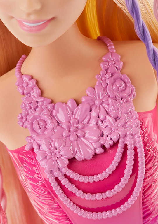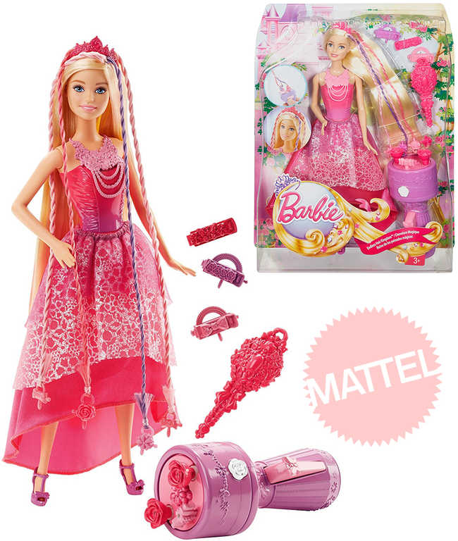 Také sníš o tom, mít panenku s nejdelšími a nejkrásnějšími vlasy? Tak teď ti Barbie právě plní tvůj sen! Je tu nová princezna s kouzelnými více než 20cm dlouhými vlasy! A nejen to, s pomocí speciálního nástroje z tebe udělá velkou vlasovou stylistku. Na krásné blond vlasy panenky s růžovo-fialovým melírem můžeš připevnit 4 barevné korálky! Nejprve korálky zacvakni do nástroje, pak vyber, jestli chceš přidat dva nebo tři korálky a stiskem tlačítka se rázem dokonale natočí. Díky této hře se holčičky naučí pracovat s vlasy jako opravdové kadeřnice! Fantazii se meze nekladou! Pro nekonečně kouzelnou hru s vlasy jsou přiložené doplňky – hřeben, čelenka a tři sponky. Všechny tyto originální doplňky a sponky můžeš nosit i ty sama! Zažij pohádkové dobrodružství a vytvoř Barbie trendy účes. Princezna je oblečena do barevného perlového živůtku s asymetrickou stříbrem zdobenou sukní a na nohou má elegantní střevíčky. Panenky se prodávají samostatně, v závislosti na dostupnosti. Přístroj pro úpravu vlasů a korálky se prodávají společně s panenkou. Panenka nestojí samostatně. Barvy a doplňky se mohou lišit.