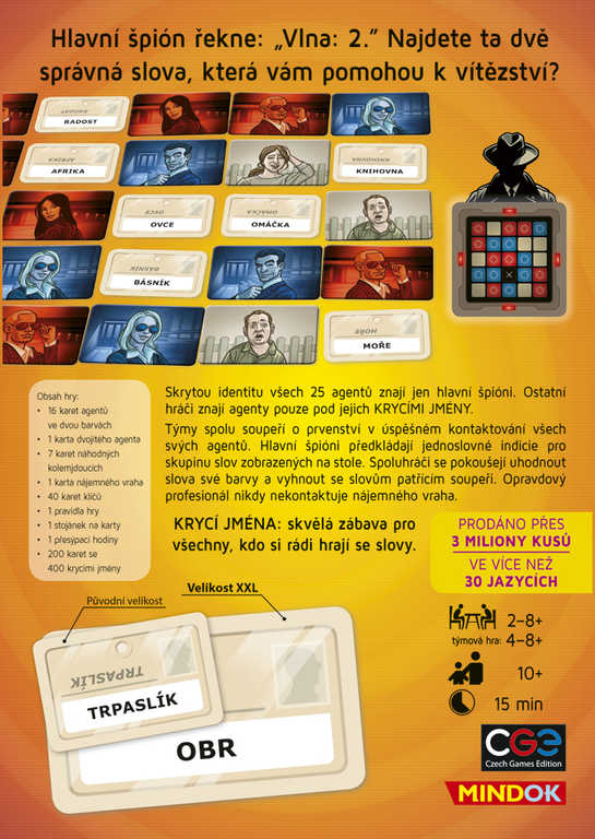 Hlavní špión řekne: „Vlna 2“. Najdete ta dvě správná slova, která vám pomohou k vítězství? Skrytou identitu všech 25 agentů znají jen hlavní špióni. Ostatní hráči znají agenty pouze pod jejich KRYCÍMI JMÉNY. Týmy spolu soupeří o prvenství v úspěšném kontaktování všech svých agentů. Hlavní špióni předkládají jednoslovné indicie pro skupinu slov zobrazených na stole. Spoluhráči se pokoušejí uhodnout slova své barvy a vyhnout se slovům patřícím soupeři. Opravdový profesionál nikdy nekontaktuje nájemného vraha. KRYCÍ JMÉNA: skvělá zábava pro všechny, kdo si rádi hrají se slovy.
