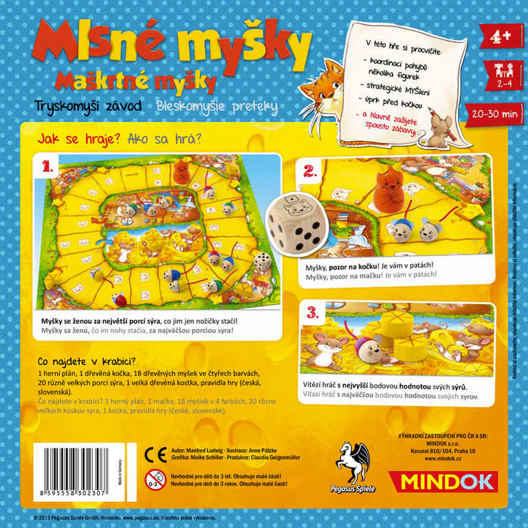 Obsah balení: 1 herní plán, 1 dřevěná kočka, 18 dřevěných myšek ve čtyřech barvách, 20 různě velkých porcí sýra, 1 velká dřevěná kostka, česká a slovenská pravidla hry