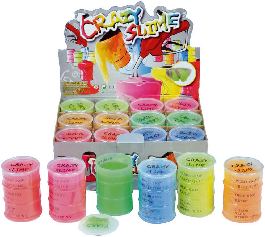 Zábavná slizovitá hmota pro děti Crazy slime, v šesti barevných variantách v plastovém sudu.