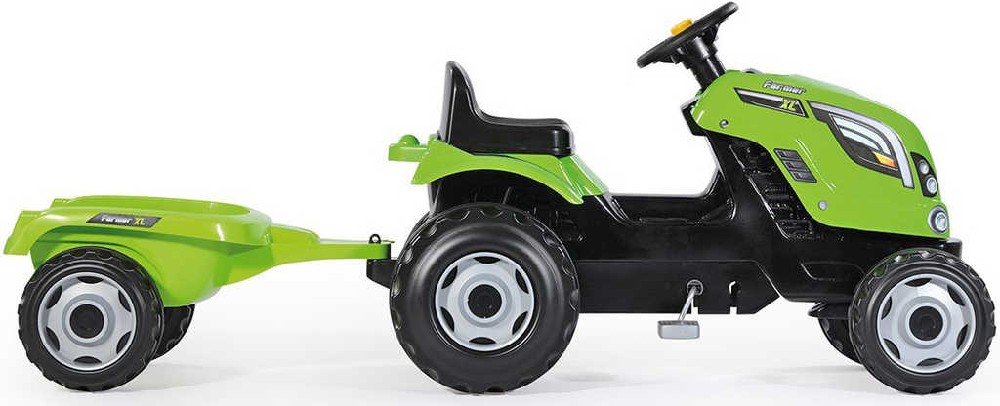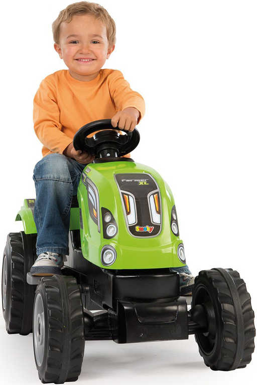 Šlapací traktor s volantem a přívěsným vozíkem, který lze odpojit. Odklápěcí kryt motoru. Nastavitelné sedadlo dle výšky dítěte. Klakson na volantu. Vyrobeno z velmi kvalitního plastu. Rozměry vč. vozíku: 142 x 54,5 x 44 cm. Délka traktoru bez vozíku cca 80 cm. Hmotnost 6,3 kg.