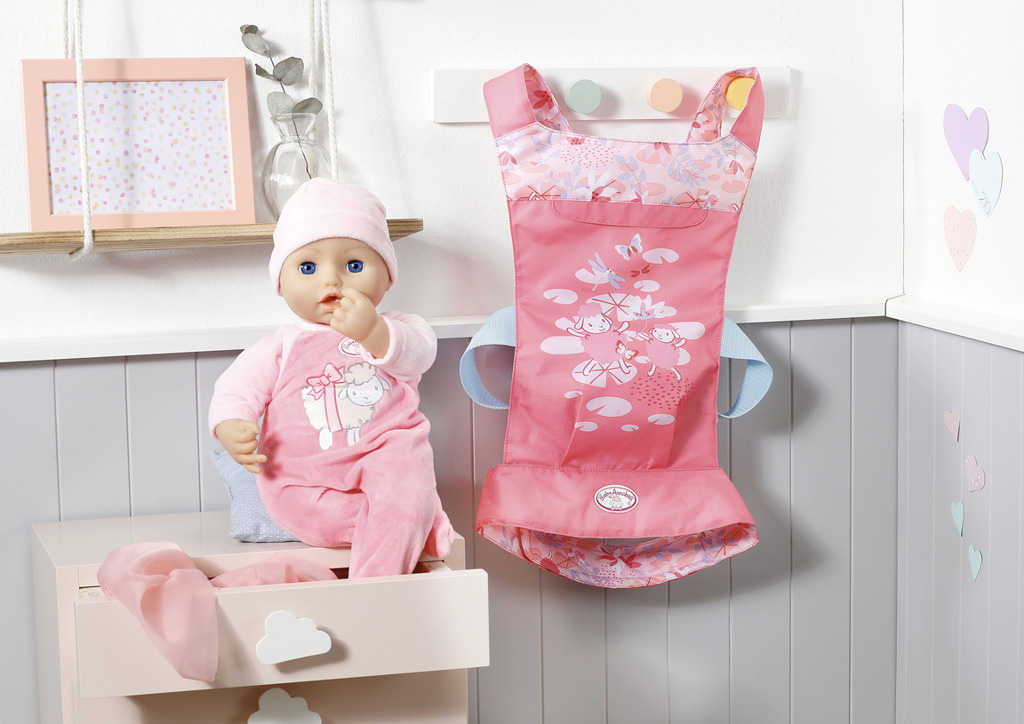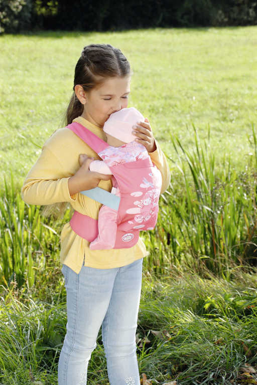 vidí. Vpředu jsou dokonce možné dvě polohy na sezení. Baby Annabell se dívá dopředu a vše pečlivě pozoruje, nebo je otočená k mamince a může se hezky tulit. Roztomilé potisky zobrazují oblíbená