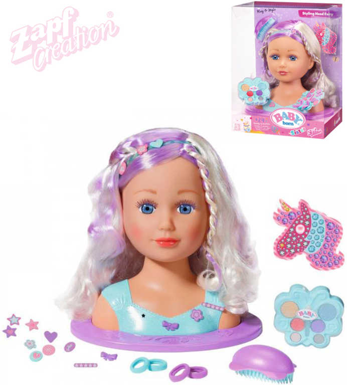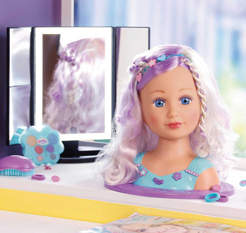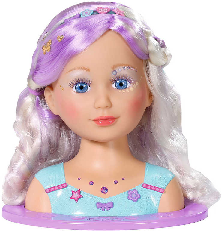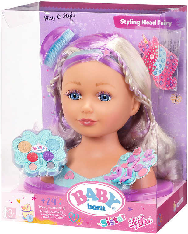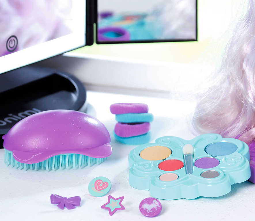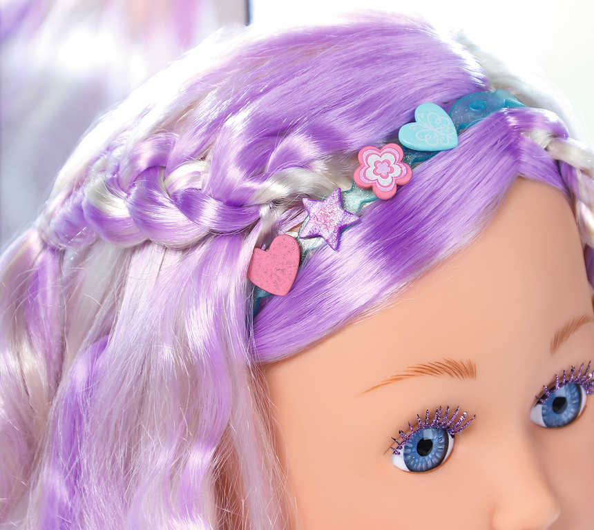 Vysoce kvalitní vlasy s barevným vzorem pro dlouhotrvající stylingovou zábavu. Balení obsahuje 24 doplňků v pohádkovém stylu: módní kartáč, vlasové sponky, gumičky a make up. Vše lze použít nejen na vlásky a obličej panenky ale i holčičky.
