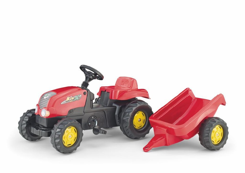 Dětský šlapací traktor Rolly Kid Steyr v červeném provedení, jehož součástí je také vlečka. Je vyroben z velmi kvalitního plastu a má otevíratelnou kapotu.