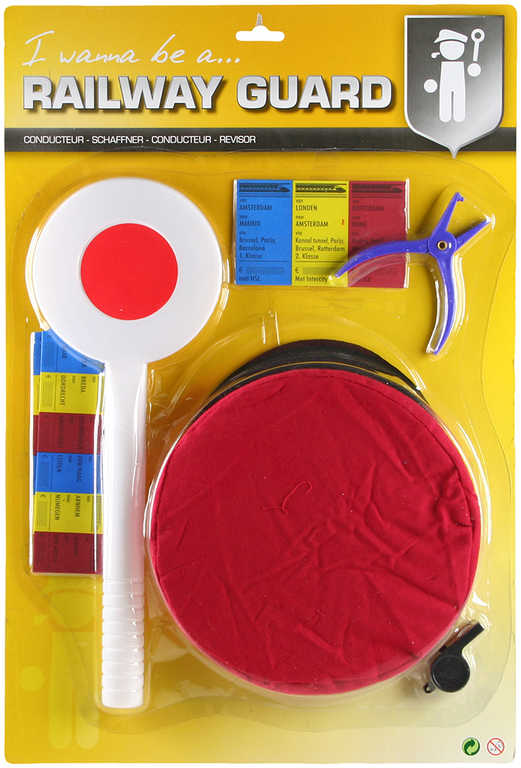 Sada výpravčí obsahuje: čepici o velikosti cca 20 cm X 20 cm ( s kšiltem 23 cm), plácačku o velikosti cca 33 cm, píšťalku, kleštičky o velikosti cca 9 cm, jízdenky..Vše z plastu, čepice látková. Věk 3+