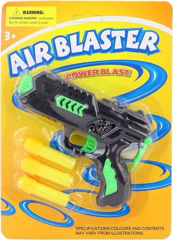 Air Blaster – Plastová dětská pistole v černo-zeleném provedení na lehké, soft náboje, které jsou také součástí balení. Bezpečná hračka pro všechny malé bojovníky. Baleno na kartě.