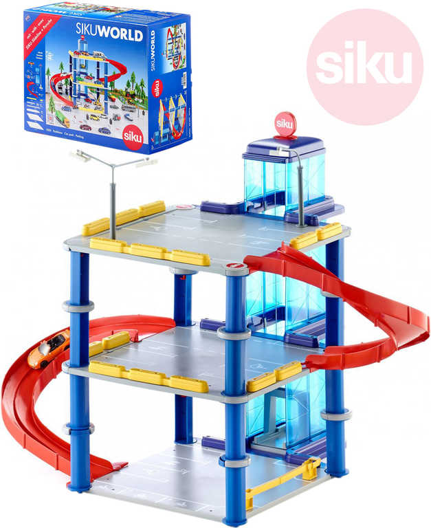 SIKUWORLD se rozrůstá. 3 patrová garáž nabízí ve světě SIKUWORLD mnoho parkovacích míst. Její barevná kombinace zapadá do dětského pokojíčku. Lze snadno integrovat ke dvěma stávajícím SIKUWORLD sadám, než mít pouze samostatnou stojící garáž. Sada obsahuje oranžové autíčko Porsche kabriolet. Sjezdové garážové cesty jsou dostatečně prostorné a parkovací boxy jsou očíslované a výtahem lze autíčko vyvézt až na střechu garáže. Jízda dolů je velmi rychlá, protože vozidlo jede z horního patra dolů do výstupní brány bez zastavení.