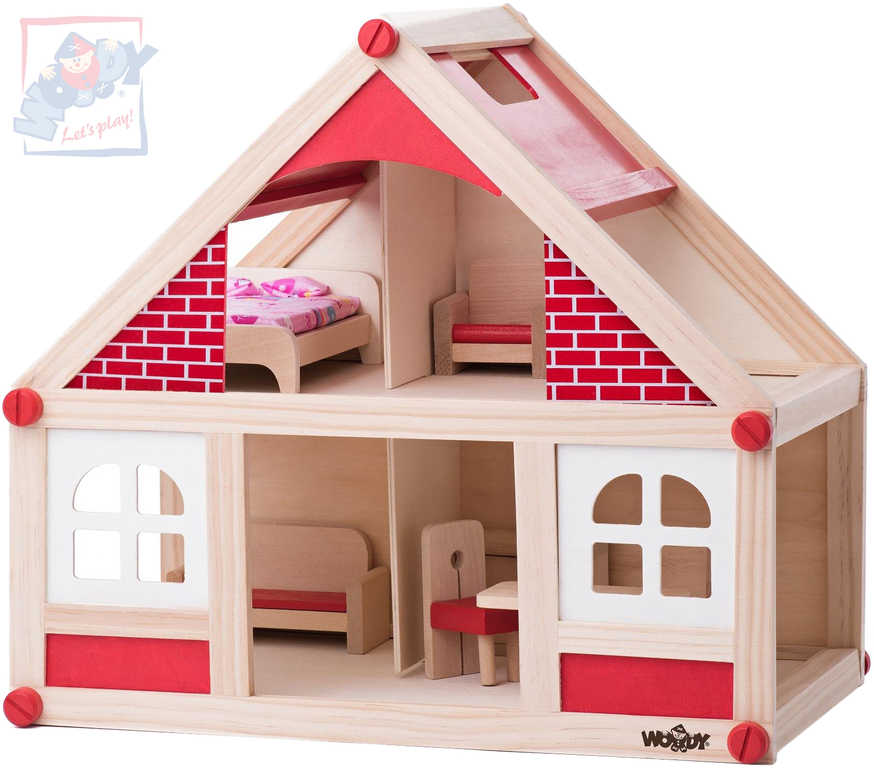 WOODY DŘEVO Domeček malý set se 2 panenkami a doplňky DŘEVĚNÉ HRAČKY